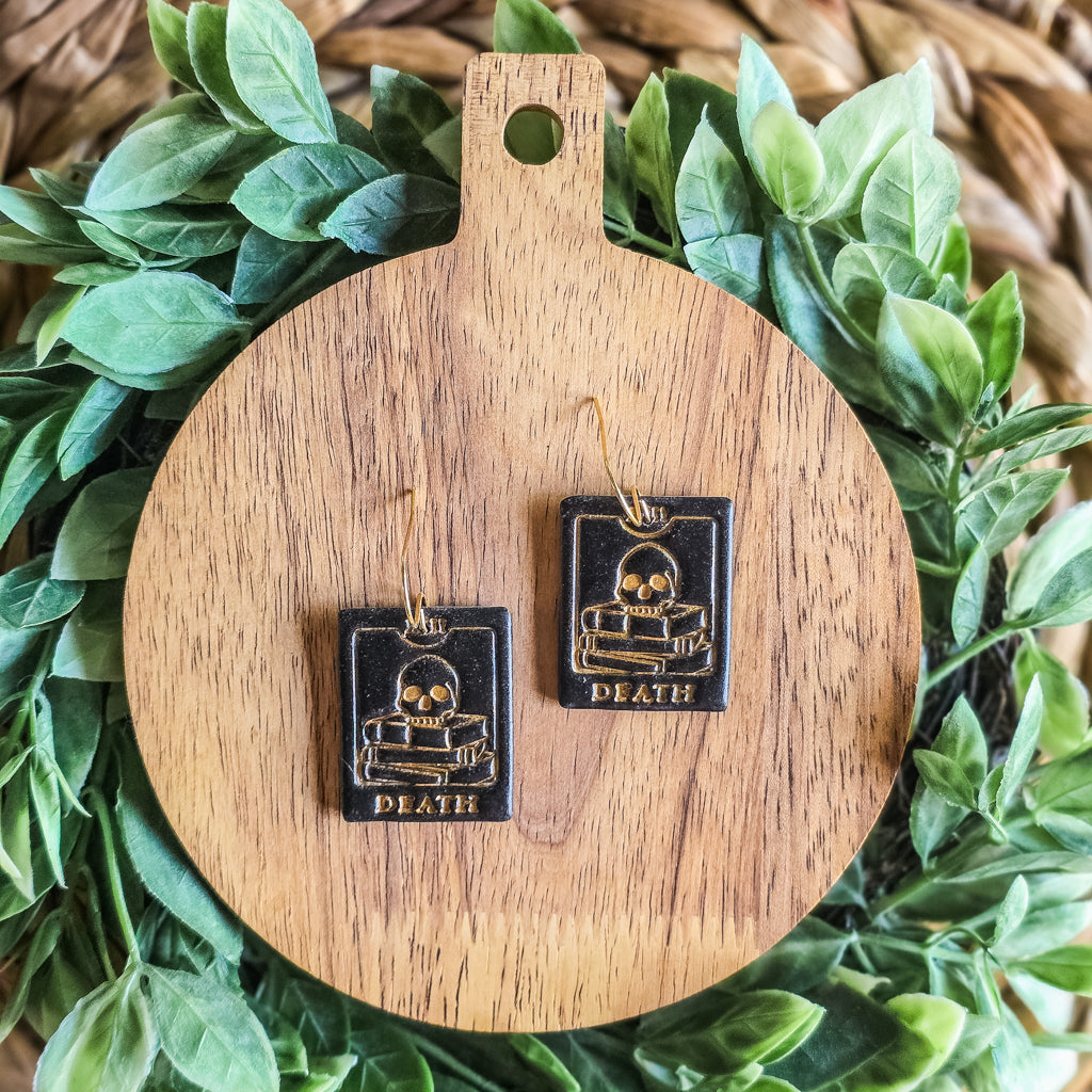 lightweight polymer clay tarot card featuring gold painted embossed detailing of a skull atop of a stack of books